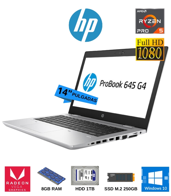 HP ProBook 645 G4 es un portátil profesional reacondicionado con un chasis ultra ligero acabado en un color plata moderno y natural. Con su procesador AMD Ryzen™ PRO trabaja con seguridad y eficiencia. Tiene una pantalla HD de 14" y la tarjeta gráfica Radeon™ Vega, diseñada específicamente para dar una respuesta altamente receptiva que ayuda a asegurar tus datos, equipo e identidad.