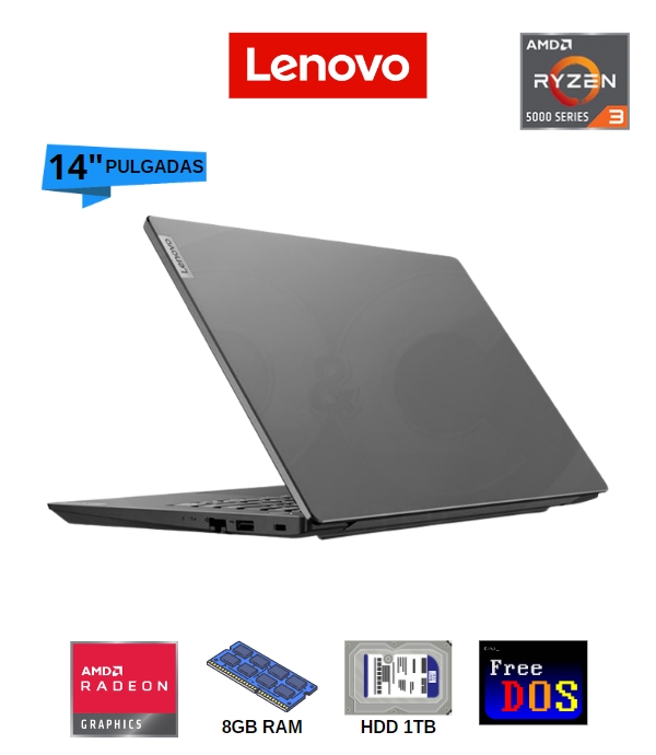 Laptop Lenovo V14 G2 ALC, 14" HD TN, AMD Ryzen 3 5300U 2.6 / 3.8GHz, 8GB DDR4 1TB HDD 5400 rpm 2.5", Video Integrado AMD Radeon Graphics, Audio HD / Realtek ALC3287 Codec + Stereo Speakers 1.5W x2 Dolby Audio, LAN GbE (RJ-45), Wireless Intel 802.11ac 2x2 + Bluetooth 5.0, Cámara Web 0.3MP con obturador de privacidad + Microfono 2x Matriz, Teclado Non-Backlit en español (LA), Bateria Integrada 38Wh, Color Iron Grey (Gris). No incluye Sistema Operativo.