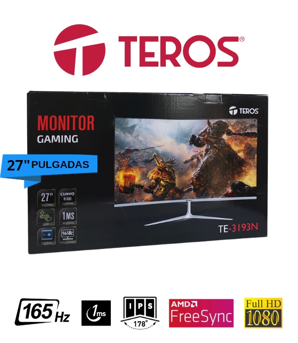 Monitor Teros TE-3193N, 27", IPS, Curvo, 165 Hz, 1920x1080 FHD, HDMI / DP / FREESYNC / VESA Relación de aspecto 16:9, brillo 250 cd/m2, contraste dinámico: 1000:1, tiempo de respuesta 1 ms, auto-voltaje.